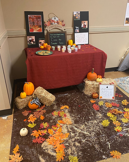 The theory used here is sense of place. We chose to do a pumpkin patch as many of us have a universal experience and connection to pumpkin patches. We also wanted to create a multi-sensory experience including taste, touch, sight and smell. I baked pumpkin cookies and had apple cider for taste, we had apple spice scent for smell, different colors for sight, and pumpkins and haybales for touch.